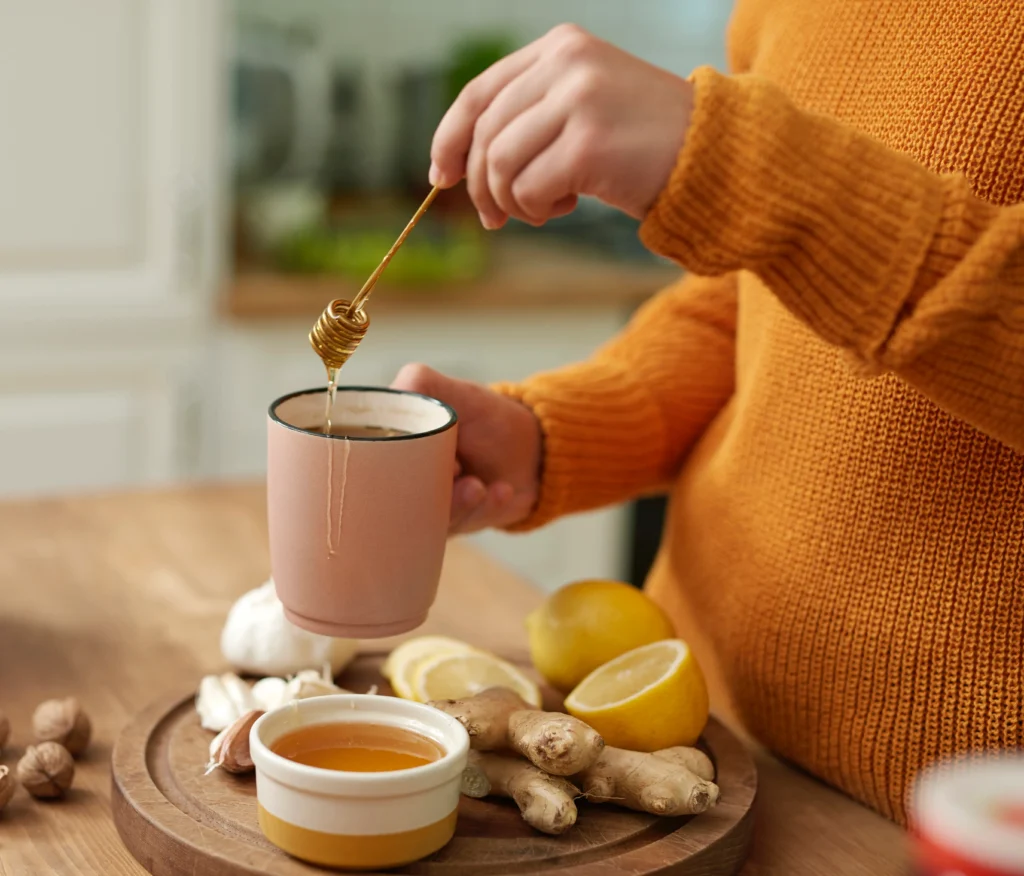 ACV has antibacterial properties and helps balance the body’s pH. It also soothes a sore throat and reduces mucus discomfort.